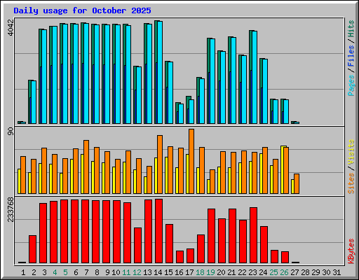 | Day | Hits | Files | Pages | Visits | Sites | KBytes | ||||||